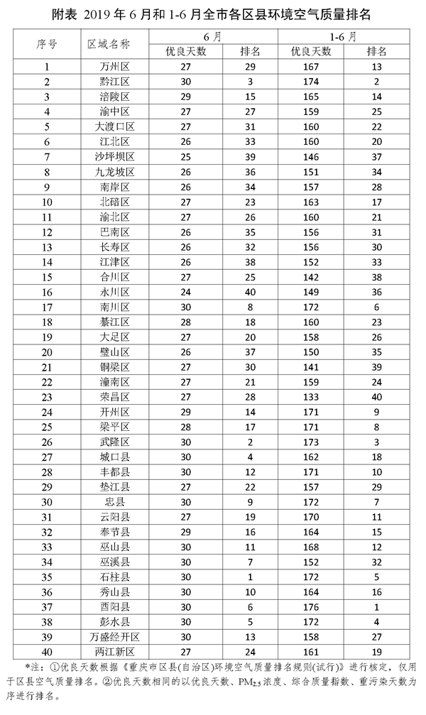 2019年6月和1~6月重庆市及各区县空气质量状况