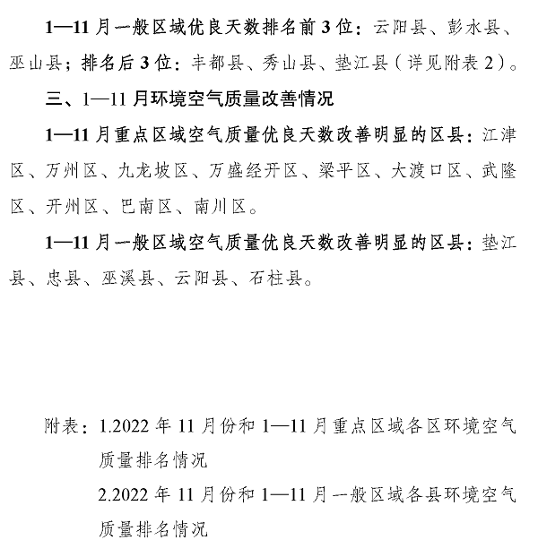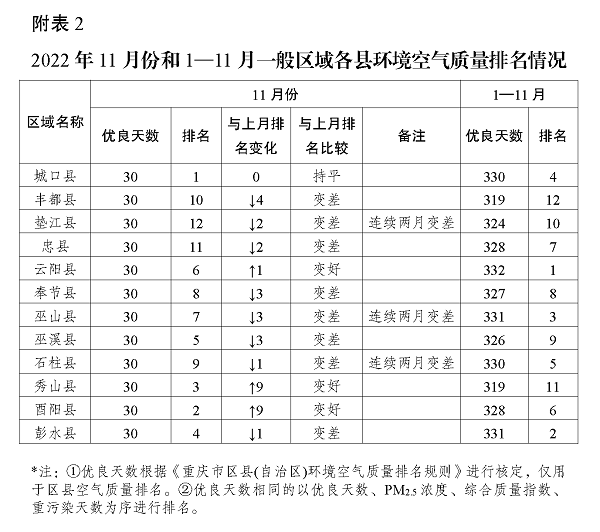 2022年11月和1-11月重庆市及各区县(自治县)环境空气质量状况